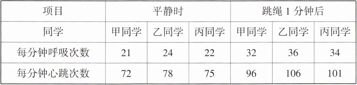 |项目|平静时|跳绳1分钟后|