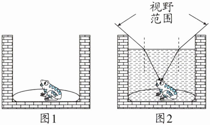(3)如图2,假如井中有水,此时光传播到水中会发生______现象,被改变方向后光仍然是沿______传播的,但比起没水的井来说青蛙的视野范围会变______(填“大”或“小”)。