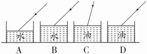 (2)B D 解析:因为该实验是对比实验,变量只能有一个,其他所有条件保持不变,因此为了保证实验的准确性,应该选择B 和D两组进行实验,只有水、油不同,光的照射角度、液体的高度一样。
