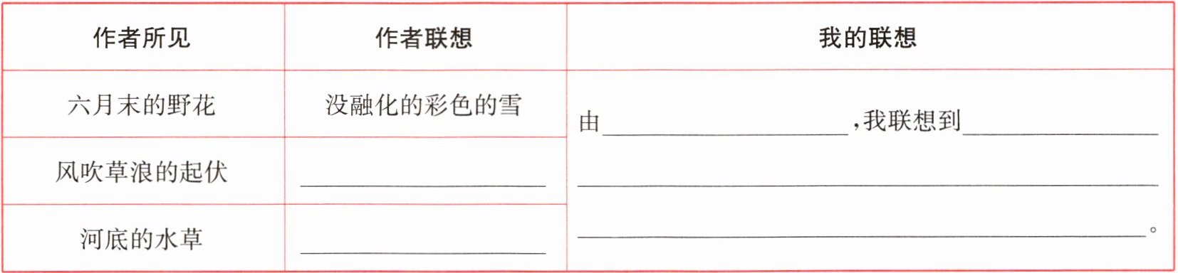 1. (阅读要素)请你根据文章填空,然后选一个作者所见的景物试着想开去。