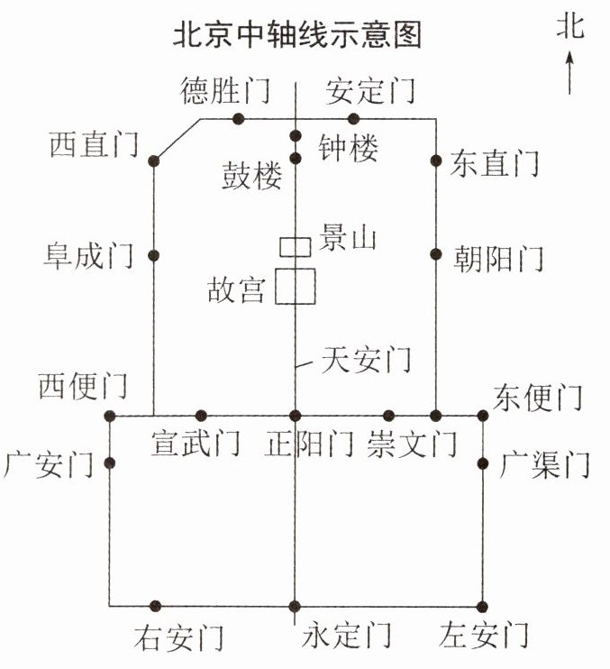 [材料一] 北京中轴线(如右图所示),创建于元代,成型、完善于明清两代,是北京城市建筑东西对称布局的对称轴。北京城诸多重要建筑位于此条轴线上。我国著名的建筑历史学家梁思成说:“北京独有的壮美秩序就由这条中轴线的建立而产生。”
