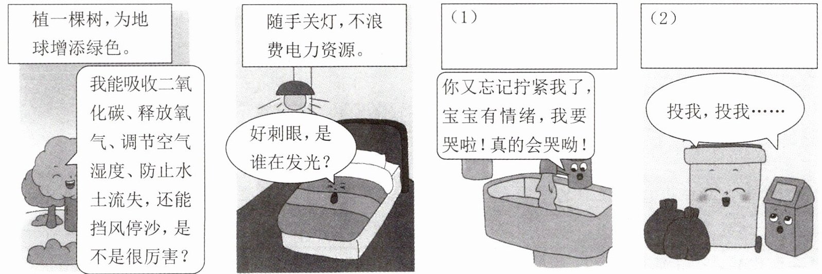 6 月 5 日是世界环境日。请参照前两幅图的宣传标语,为后两幅图写上宣传标语。