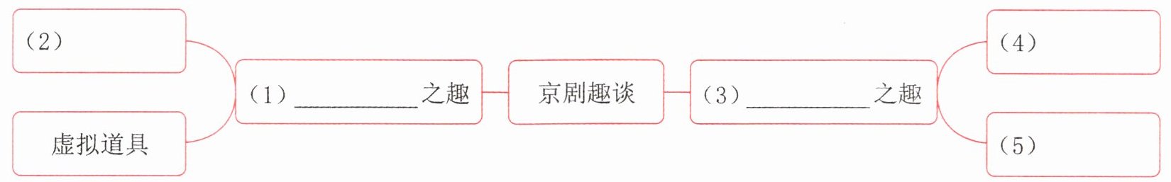 【解析】:本题主要考查对课文《京剧趣谈》内容的理解与概括,需要从课文中提取关键信息,梳理出围绕京剧的不同方面的趣味点,完成思维导图。课文主要从马鞭等道具以及亮相等表演特点等方面来谈京剧的趣味,所以可根据这些内容来填空。