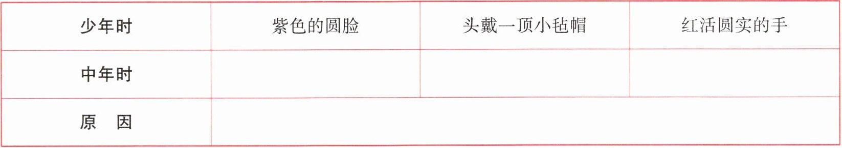 | 中年时 | 灰黄,加上了很深的皱纹 | 一顶破毡帽 | 又粗又笨而且开裂,像是松树皮了 |