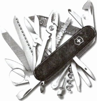 4. 材料阅读:现在市面上流行一种多用途军刀,它经过巧妙设计,使得刀身上包含了多种常用工具。许多国家都为本国军官和士兵配备了这种刀具,使他们可以更方便地在野外执行任务。由于它具有体积小巧、便于携带、功能全面的特点,可以称得上是一个微型工具箱,因此它也是喜欢户外运动的人士的必备装备。如图是一款多用途军刀,它包含了剪刀、小刀、放大镜等多种工具。