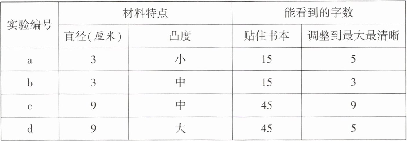 (2)科科再次利用这些放大装置观察相同大小的文字,记录了相关实验数据。