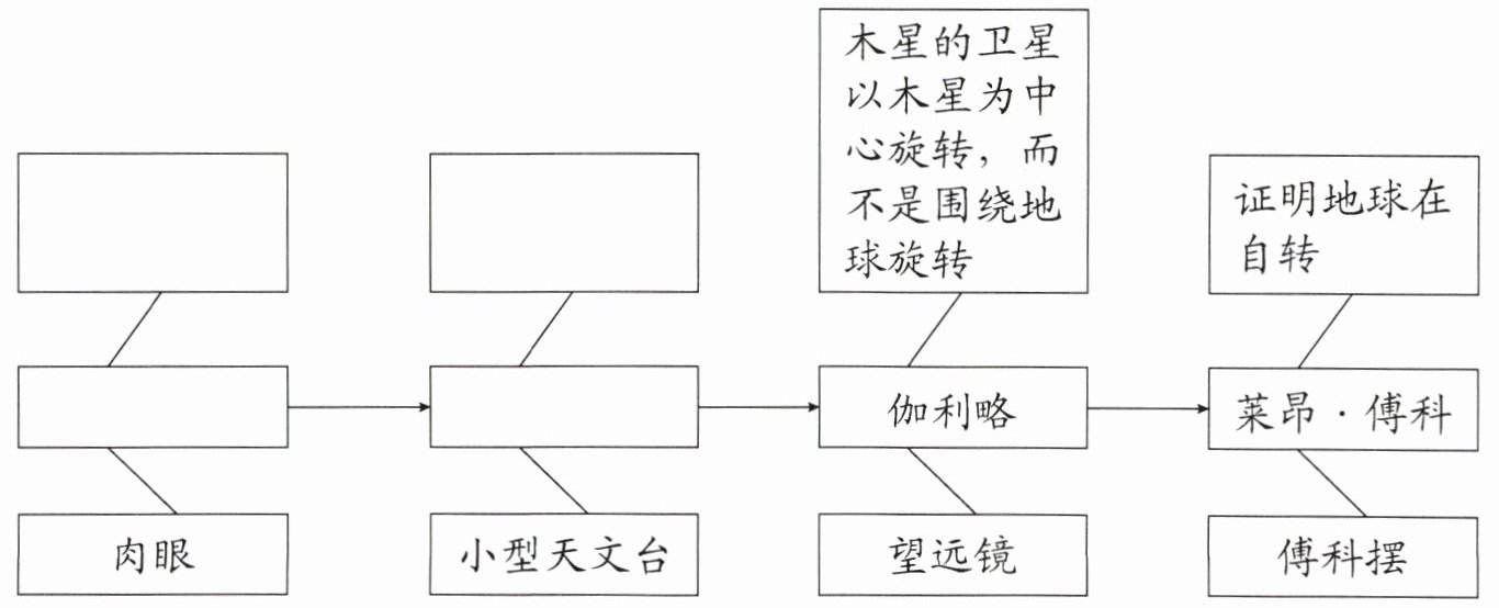 5. [模型建构] 对地球运动的探索,人类经历了漫长的过程。通过一代又一代科学家的努力,我们逐渐认识了地球运动的规律。学完这堂课后,小科制作了一个思维导图,请将合适的选项填入下图的方框中。