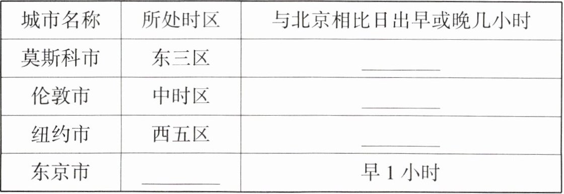 (4)东九区 晚5小时 晚8小时 晚13小时 解析:由题中材料可知,相邻两个时区的时间相差1小时。