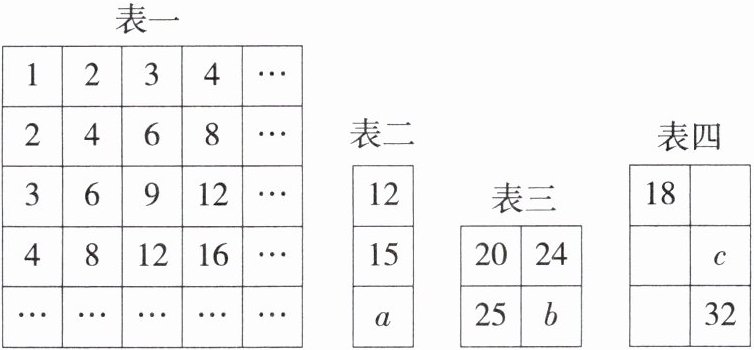 表二、表三、表四都是从表一中截取的一部分,根据你发现的规律,分别写出a,b,c的值,并简单说明理由.