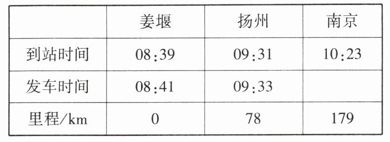 (1)由题表可得从姜堰到南京的运行时间为1h42min=102(min),路程为179km,所以平均速度为179÷102≈1.755(km/min)=105.3km/h.