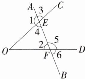 9.「2024江苏南京月考,★☆」如图,直线AB与$∠COD$的两边OC,OD分别相交于点E,F,$∠1+∠2= 180^{\circ }$,找出图中与$∠2$相等的角.