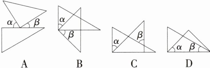 4.「2024浙江杭州期末」将一副三角尺按下列选项中的位置摆放,其中$∠α与∠β$一定相等的是( )