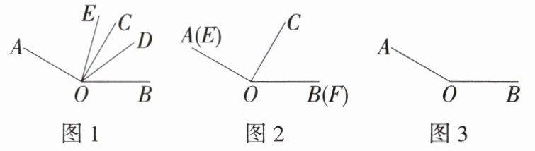 (1) 如图 1,若 $ OE $ 平分 $ \angle AOB $,$ OD $ 为 $ \angle BOC $ 内部的一条射线,$ \angle COD = \frac{1}{2} \angle BOD $,求 $ \angle DOE $ 的度数。