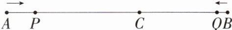 2. 如图,$ C $ 是线段 $ AB $ 上一点,$ AB = 20 \text{ cm} $,$ BC = 8 \text{ cm} $,点 $ P $ 从点 $ A $ 出发,以 $ 2 \text{ cm/s} $ 的速度沿 $ AB $ 向右运动,终点为 $ B $;点 $ Q $ 从点 $ B $ 出发,以 $ 1 \text{ cm/s} $ 的速度沿 $ BA $ 向左运动,终点为 $ A $。已知 $ P $,$ Q $ 同时出发,当其中一点到达终点时,另一点也随之停止运动。设点 $ P $ 的运动时间为 $ t $ 秒。