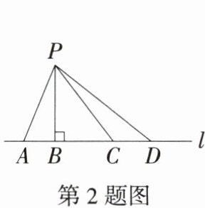 2.「2025江苏南通崇川北城中学月考」如图,直线l表示一段河道,点P表示水池,现要从河道l向水池P引水,设计了四条水渠开挖路线PA,PB,PC,PD,其中PB⊥l,要使挖渠的路线最短,可以选择的路线是(
