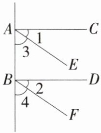 解析 AE//BF.理由如下:因为AC⊥AB,所以∠CAB=90°,即∠1+∠3=90°.同理,∠2+∠4=90°.因为∠1=∠2,所以∠3=∠4,所以AE//BF.