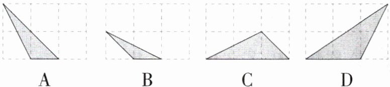 A中三角形三边长分别为1,$2\sqrt{2}$,$\sqrt{5}$;B中三角形三边长分别为$\sqrt{2}$,1,$\sqrt{5}$;C中三角形三边长分别为$\sqrt{5}$,3,$\sqrt{2}$;D中三角形三边长分别为2,$\sqrt{5}$,$\sqrt{13}$.