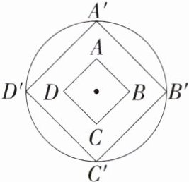 9.新考向数学文化[2024 江苏常州中考调研,☆☆]《墨子·天志》记载:“执规矩,以度天下之方圆.”度方知圆,感悟数学之美.如图,正方形 ABCD 的面积为 2,以它的对角线的交点为位似中心,作它的位似图形$A'B'C'D'$,若$AB:A'B'= 1:2$,则四边形$A'B'C'D'$的外接圆的半径为____.