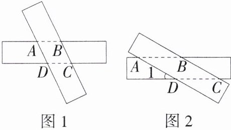 (2)已知矩形纸条的宽度为 $2\ \text{cm}$,将矩形纸条旋转至如图 2 所示的位置时,四边形 $ABCD$ 的面积为 $8\ \text{cm}^2$,求此时直线 $AD$、$CD$ 所夹锐角 $\angle 1$ 的度数。