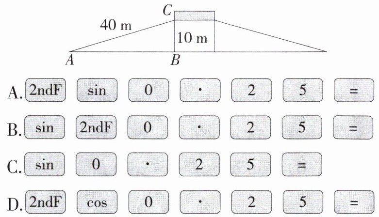 2. 「2024 山东淄博淄川期末」如图,为方便行人推车过天桥,某市政府在 $10\ \text{m}$ 高的天桥两端分别修建了 $40\ \text{m}$ 长的斜道,用科学计算器计算其中一条斜道的倾斜角 $\angle A$,下列按键顺序正确的是(