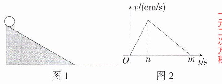 9.新课标推理能力跨物理匀变速运动如图1,一小球从斜面顶端由静止开始沿斜面下滚,呈匀加速运动状态,速度每秒增加$2cm/s$;然后在水平地面上继续滚动,呈匀减速运动状态,滚动速度每秒减小$0.8cm/s$.速度$v(cm/s)与时间t(s)$的关系如图2中的实线所示.(提示:根据物理学知识可知,物体匀加速运动时的路程$s= 平均速度\overline{v}×时间t$,$\overline{v}= (v_{0}+v_{t})÷2$,其中$v_{0}(cm/s)$是开始时的速度,$v_{t}(cm/s)是t$秒时的速度,匀减速运动时的路程和平均速度类似可得)