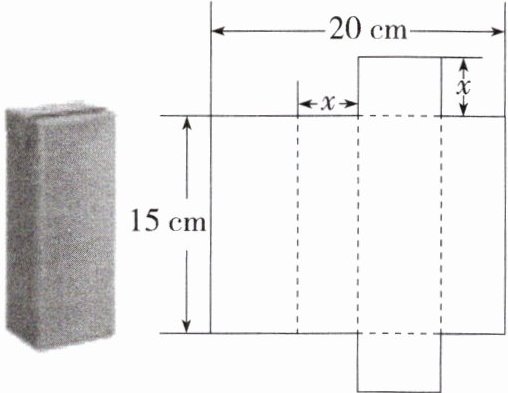 解析 由题意可得长方体的高为15cm,其底面是一个矩形,其中一边长为x cm,与其相邻的边长为$\frac{20 - 2x}{2}$cm,所以利用容积列出关于x的方程为$15x\cdot\frac{20 - 2x}{2}=360$.