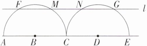 7. 「2024 江苏南师附中树人学校月考,」如图,点$C是AE$的中点,在$AE同侧分别以AC$、$CE为直径作半圆B$、半圆$D$。直线$l// AE$,且与两个半圆依次相交于$F$、$M$、$N$、$G$不同的四点。若$AE = 10$,$FG = x$,$MN = y$,则$y与x$之间的函数表达式为______。