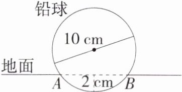 4. 「2025 江苏宿迁宿城期中」在练习掷铅球项目时,某同学掷出的铅球直径为 10 cm,在操场地上砸出一个深 2 cm 的小坑,如图,则该坑的直径$AB$为______cm。
