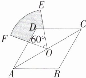 9. 「2024 山东日照中考,☆☆」如图,在菱形 $ABCD$ 中,$AB = 2$,$\angle B = 120^{\circ}$,点 $O$ 是对角线 $AC$ 的中点,以点 $O$ 为圆心,$OA$ 长为半径作圆心角为 $60^{\circ}$ 的扇形 $OEF$,点 $D$ 在扇形 $EOF$ 内,则图中阴影部分的面积为(