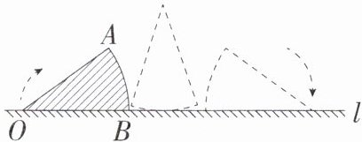 (2)「2024 江苏宿迁沭阳调研」如图,在扇形纸片 $AOB$ 中,$OA = 10$,$\angle AOB = 36^{\circ}$,$OB$ 在桌面内的直线 $l$ 上。现将此扇形沿 $l$ 按顺时针方向旋转(旋转过程中无滑动),当 $OA$ 落在 $l$ 上时,停止旋转,则点 $O$ 所经过的路线长为