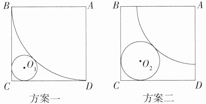 11. 某铁匠要制作一个圆锥模型,操作规则是在一块边长为 16 cm 的正方形纸片上剪出一个扇形和一个圆,使得扇形围成圆锥的侧面时,圆恰好是该圆锥的底面。他首先设计了如图所示的方案一,发现这种方案不可行,于是他调整了扇形和圆的半径,设计了如图所示的方案二。(两个方案的图中,圆与正方形相邻两边及扇形的弧均相切.方案一中扇形的弧与正方形的两边相切)