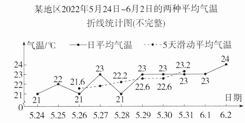 (1)$\frac{1}{5}×(22+21+23+21+23)=22$(℃).答:2022年5月27日的“5天滑动平均气温”为22℃.