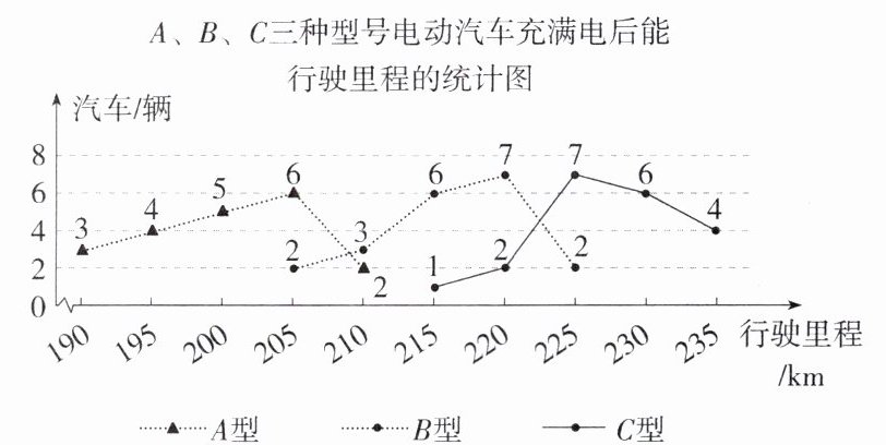 (1)A型号汽车的平均里程为$\frac {190×3+195×4+200×5+205×6+210×2}{3+4+5+6+2}=200(km)$;将20个数据按从小到大的顺序排列,第10,11个数据均为200 km,所以中位数为200 km;205 km出现了6次,出现的次数最多,所以众数为205 km.