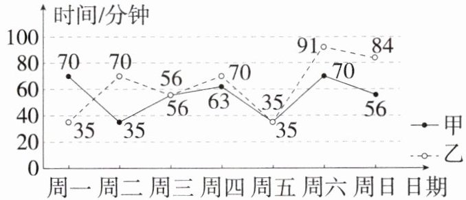 C A.乙的众数为35分钟和70分钟,故不符合题意;B.甲的数据由小到大排列为35、35、56、56、63、70、70,中位数是56分钟,故不符合题意;C.由折线统计图可知,乙每天校外锻炼的时间比甲的波动大,所以乙的方差比甲的大,故符合题意;D.甲的平均数为$\frac{1}{7}$×(70 + 35 + 56 + 63 + 35 + 70 + 56)=55,乙的平均数为$\frac{1}{7}$×(35 + 70 + 56 + 70 + 35 + 91 + 84)=63,因为55 < 63,所以甲的平均数比乙的小,故不符合题意.故选C.