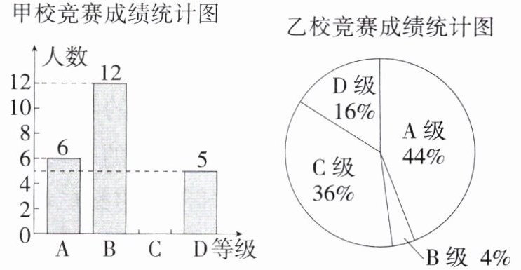 ∴甲校C级的人数为25 - (6 + 12 + 5)=2,将甲校竞赛成绩统计图补充完整如下:
