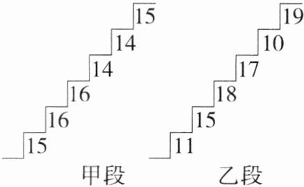 15.(14分)在某旅游景区上山的一条小路上有一些断断续续的台阶.如图所示的是其中的甲、乙两段台阶路的示意图,其中图中的数字表示每一级台阶的高度(单位:cm).请你用所学过的有关统计知识(平均数、中位数、方差和极差)回答下列问题: