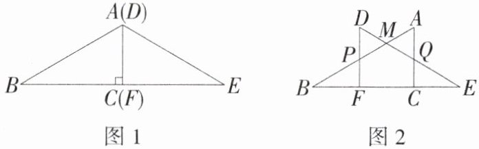 7.如图1,放置两个全等的含有$30^{\circ}$角的直角三角尺ABC与DEF($∠B = ∠E = 30^{\circ}$).若将三角尺ABC向右以每秒1个单位长度的速度移动(点C与点E重合时移动终止),移动过程中始终保持点B,F,C,E在同一条直线上,如图2,AB与DF,DE分别交于点P,M,AC与DE交于点Q,其中$AC = DF = \sqrt{3}$,设三角尺ABC的移动时间为x秒.