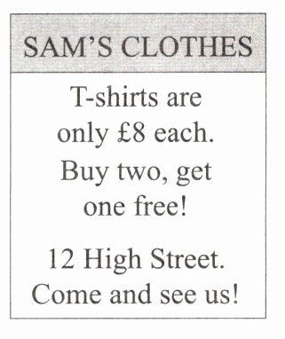 15. C 根据图片可知,T 恤衫的价格是 8 英镑一件,买两件送一件。因此从图片中可知道 T 恤衫多少钱。故选 C。