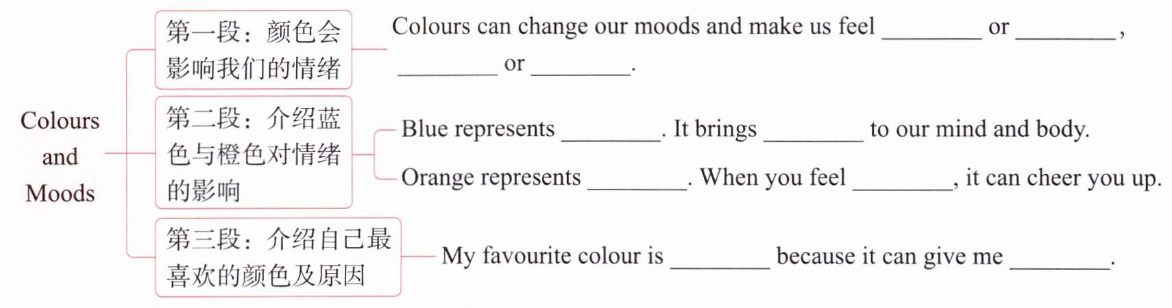 请以“Colours and Moods”为题,选择两种颜色(分别代表 calm colour 和 warm colour)来介绍它们对情绪的影响,并谈谈你自己最喜欢的颜色。写作要点及要求如下:
