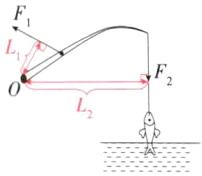 1. [2025 江苏泰州高港月考] 如图所示为钓鱼竿钓鱼的示意图,O 为支点,请画出$F_{1}$、$F_{2}的力臂L_{1}和L_{2}$。