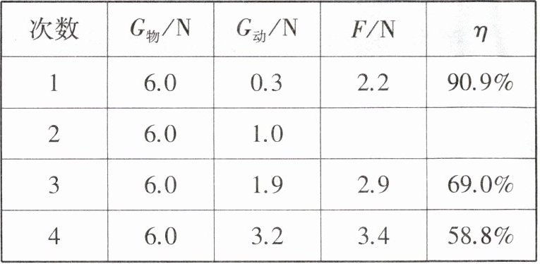 %。分析数据可知:在物重不变的情况下,动滑轮越重滑轮组的机械效率越低