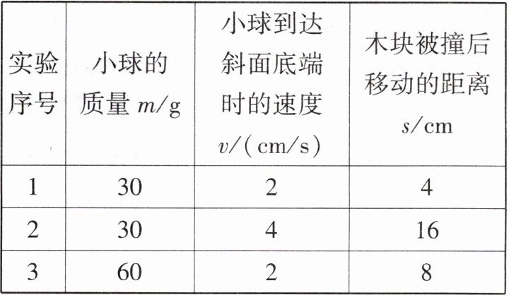 |实验序号|小球的质量m/g|小球到达斜面底端时的速度v/(cm/s)|木块被撞后移动的距离s/cm|