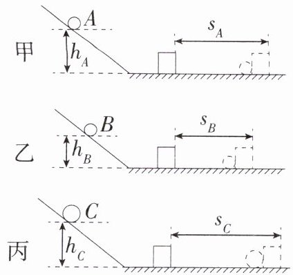 7.[2025江苏常州金坛期中,★★] 如图所示是某学习小组"探究物体的动能大小与哪些因素有关"的实验装置图,其中三个小球质量$m_{A}= m_{B}\lt m_{C}$,起始高度$h_{A}= h_{C}\gt h_{B}$,使用同一木块进行实验。