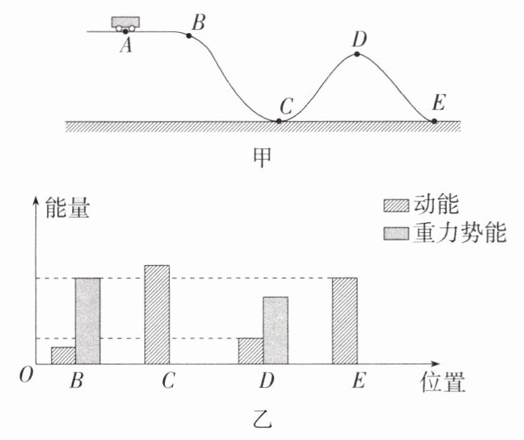 6.[2022广东中考,★★] 图甲中过山车从A点出发,先后经过B、C、D、E点。图乙是过山车在B、C、D、E点的动能和重力势能大小的示意图,则过山车的动能在