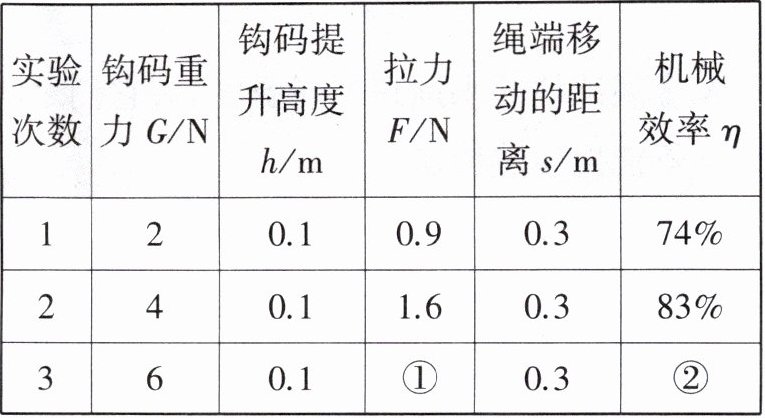 |实验次数|钩码重力G/N|钩码提升高度h/m|拉力F/N|绳端移动的距离s/m|机械效率η|