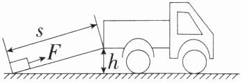 14. [2025江苏太仓期末]工人师傅用斜面把重物搬运到汽车上,车厢底板高度为1.5 m,斜面长度为3 m,现用力F沿着斜面把$G= 1800\ \text{N}$的重物匀速拉到车上。若实际拉力为$F= 1200\ \text{N}$,求:(不计空气阻力)