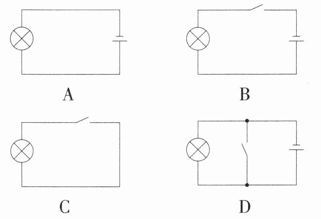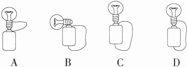 D 由图可知,D图中将小灯泡的金属触头和金属螺纹壳分别接在了干电池的两极上,是正确的接法;A图中导线没有接到干电池的负极上,没有形成通路,小灯泡不能发光;B、C两图中导线直接接在干电池的两极上,会造成电源短路,小灯泡不能发光。