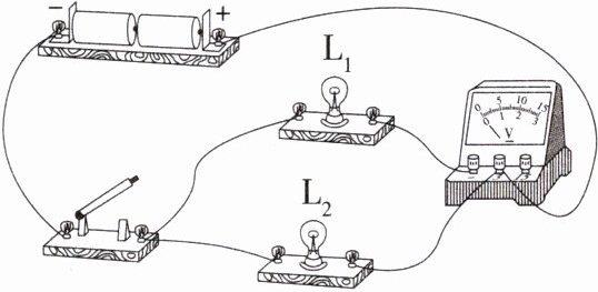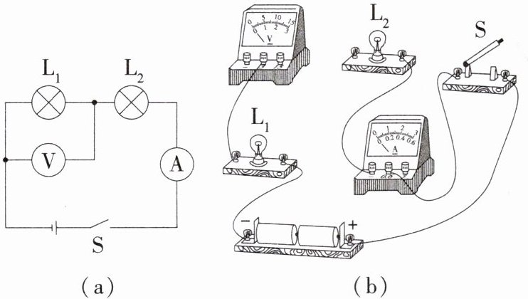 解析 由图(a)可知,L₁、L₂串联,电压表测L₁两端的电压,按照电路图先将L₁、L₂串联,最后在L₁两端并联电压表即可。