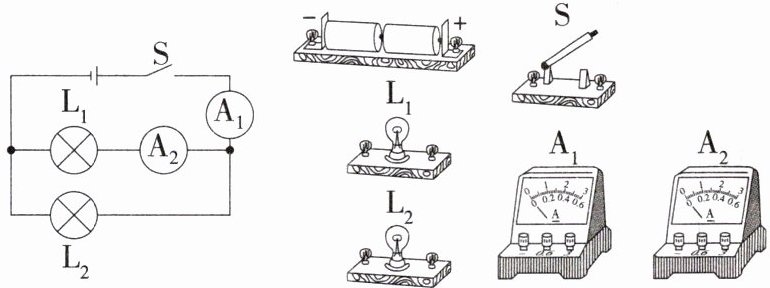 1.[2025江苏苏州姑苏振华中学期中]按照电路图连接实物图,电流表$A_1、$$A_2$的示数分别为1.2 A和0.4 A。