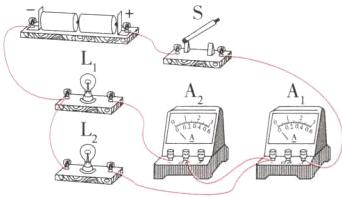 解析 由电路图可知,闭合开关S后,两灯并联,电流表A₂测灯L₁所在支路的电流,示数为0.4 A,故选用小量程与L₁串联;电流表A₁在干路,测干路电流,示数为1.2 A,选用大量程接在干路上;开关S控制整个电路,也在干路上。